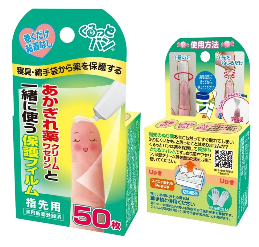 従来の絆創膏やフィルムでは薬と一緒に使うことができませんが、「くるっとバン」は粘着なく、キャンディーのように巻いてねじるという新しい使用方法で指先の薬の保護を実現しました。