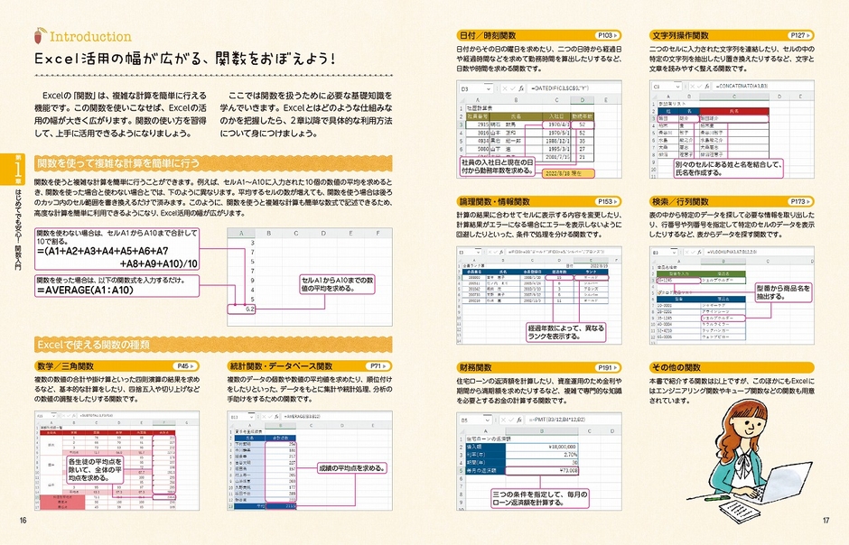 本書で紹介する関数は、「数学/三角関数」「統計/データベース関数」「日付/時刻関数」「文字列操作関数」「論理/情報関数」「検索/行列関数」「財務関数」と分類され、多岐にわたります。仕事でよく使うベーシックな関数から、ピンポイントで役に立つ専門的な関数まで、ひととおりの関数を作例サンプルデータを操作しながら学ぶことができます。