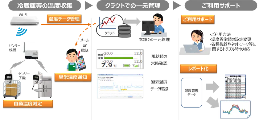 本サービスは、温度測定を自動化し、クラウド上で温度情報を一元管理することに加え、お客さまの営業体制に合わせて柔軟な設定・ご利用が可能なアラート機能や、お申し込みからご利用開始までの機器設定・設置、ご利用中のお困りごとも一元的にサポートすることで、お手軽に導入・運用していただけるサービスです。