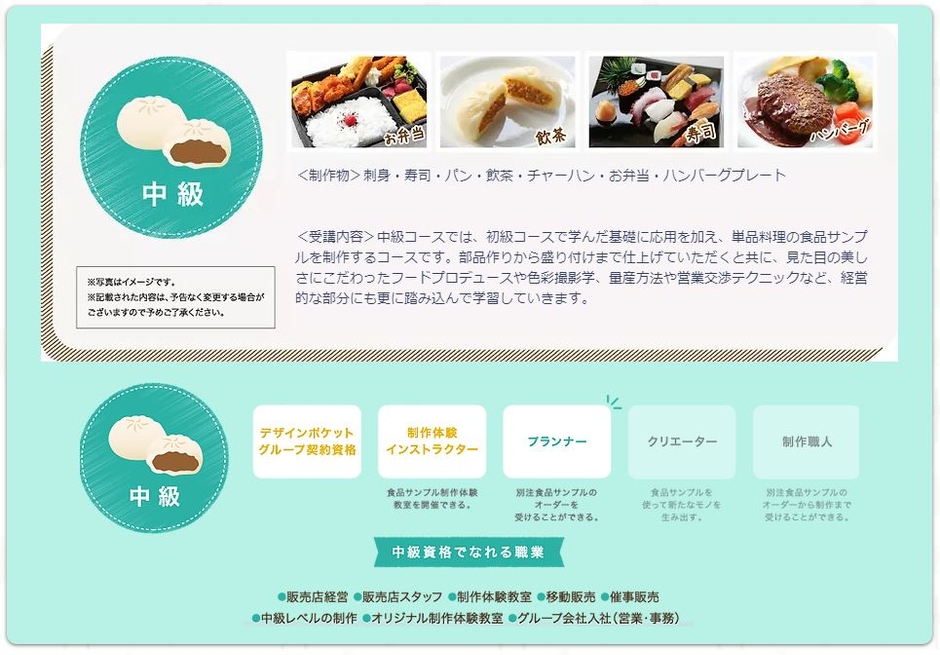 将来の独立、副業を目的としたカリキュラムには食品サンプルの作り方だけでなく、販売方法までを盛り込み様々な授業を取り入れています。初級・中級・上級のカリキュラムに分かれており、それぞれ約3カ月25時間、トータルで約1年75時間の授業となります。