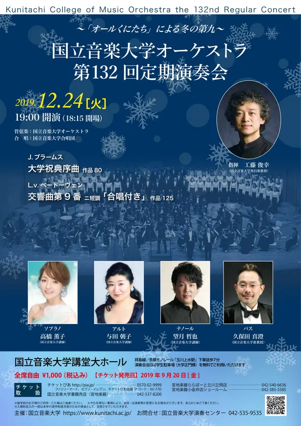 国立音楽大学(所在地:東京都立川市、学長:武田忠善)では、来る2019年12月24日(火)にベートーヴェン作曲『第九』の演奏を含む第132回オーケストラ定期演奏会を開催いたします。ソリストには、国内外で活躍する本学の講師陣である高橋薫子(ソプラノ)、与田朝子(アルト)、望月哲也(テノール)、久保田真澄(バス)、指揮に工藤俊幸、管弦楽に国立音楽大学オーケストラ、合唱に国立音楽大学合唱団と、本学が誇る“オールくにたちキャスト”で年末の風物詩とも言える『第九』を演奏いたします。