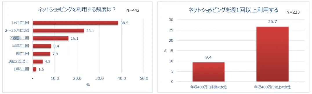 利用頻度では、「1ヶ月に1回」(38.5%)が最も多く、続いて、「2~3ヶ月に1回」(23.1%)、「2週間に1回」(16.1%)という回答が多い結果となりました。さらに性別・年収別で分析してみると、年収400万円以上の女性ではおよそ4人に1人が「週に1回以上」利用しており(26.7%)、年収400万円未満の女性(9.4%)よりも頻繁に利用していることが分かりました。年収が高いほど忙しいと仮定すると、多忙な女性ほどすきま時間にネットショッピングを活用し買い物しているのでしょうか。