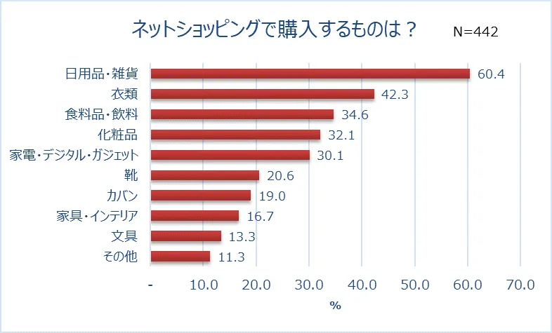 2.購入品は実用性重視の傾向 1位「日用品・雑貨」(60.4%) 2位「衣類」