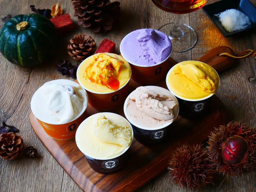 美味しい秋の味覚が楽しめる季節になりました。秋のスイーツと言えば、かかせないのが芋栗カボチャ!ジェラート専門店<マリオジェラテリア>、ワンランク上のジェラートを提供する<プレミアム マリオジェラテリア>ではそれぞれ芋、栗、カボチャを使ったジェラートの新作を販売します。それぞれそのまま食べても美味しい素材ですが、ジェラートにすることでより魅力が増すように開発した6種の新作です。