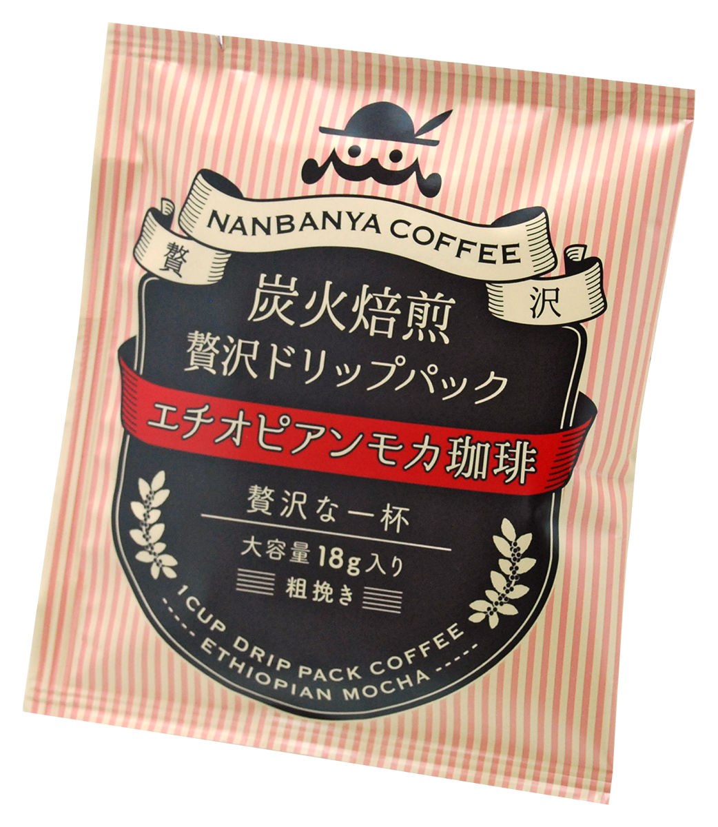 “炭火焙煎 贅沢ドリップパック『エチオピアンモカ珈琲』”は、南蛮屋の独自の炭火焙煎技術によって煎り上げられた“エチオピアンモカ”を粗挽きにし、コーヒーの粉の量を通常のドリップパックの2倍(当社比)18g使用した、贅沢なドリップパックです。