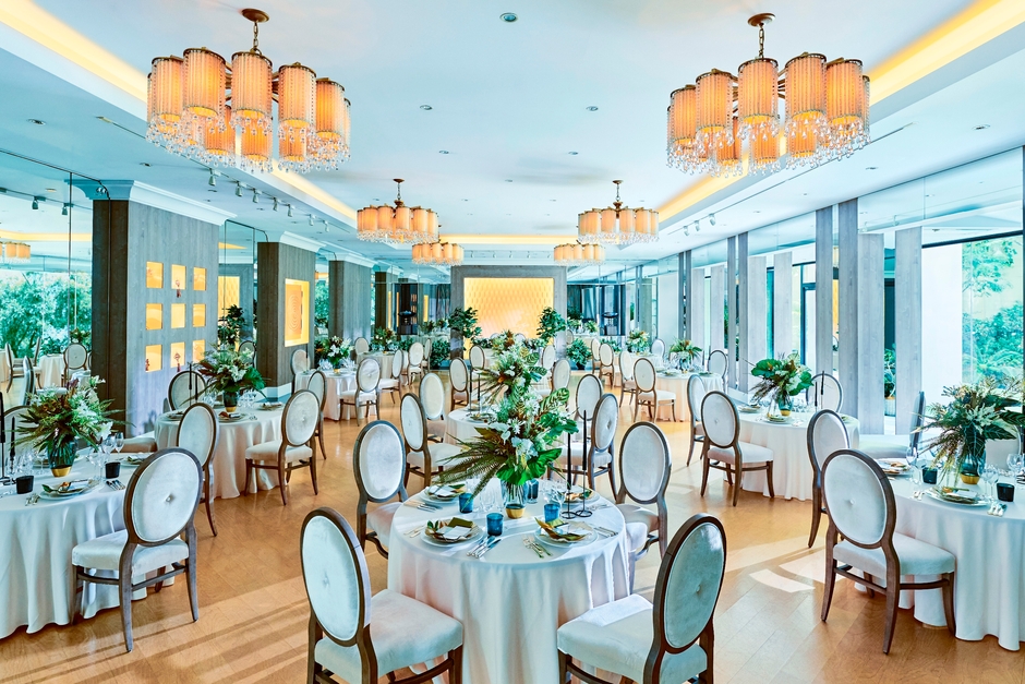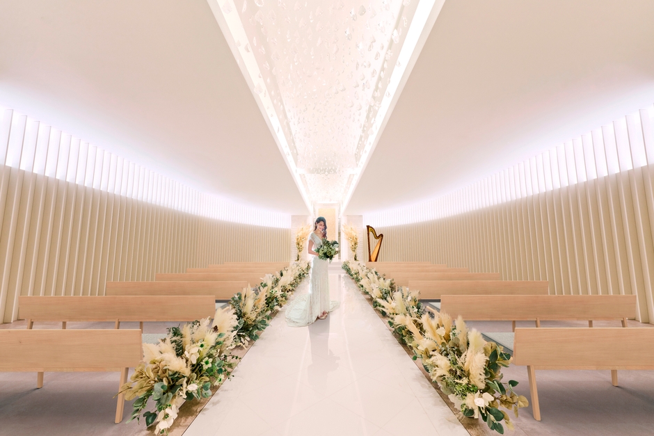 円形のデザイナーズチャペルは、左右の天井から降り注ぐ木洩れ日のような光が印象的。幾重にもかさなった羽板デザインの壁の向こうから光が漏れる作りになっています。20mもの長さを誇る大理石のバージンロード、天井に輝く1,000個のクリスタル、祭壇のマザー・オブ・パール(貝殻)、そのすべてが光をきれいに反射する非日常空間です。