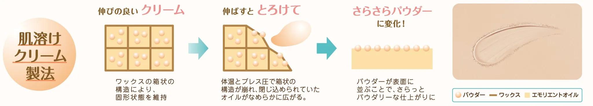 うるおいに包まれたクリームが、伸ばすとさらさらに変化します。驚くほど心地よく肌に密着し、スジやムラになりません。
