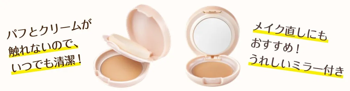 メイク直しにもうれしいミラー付き。パフとクリームが触れないケースで衛生面にもこだわりました。