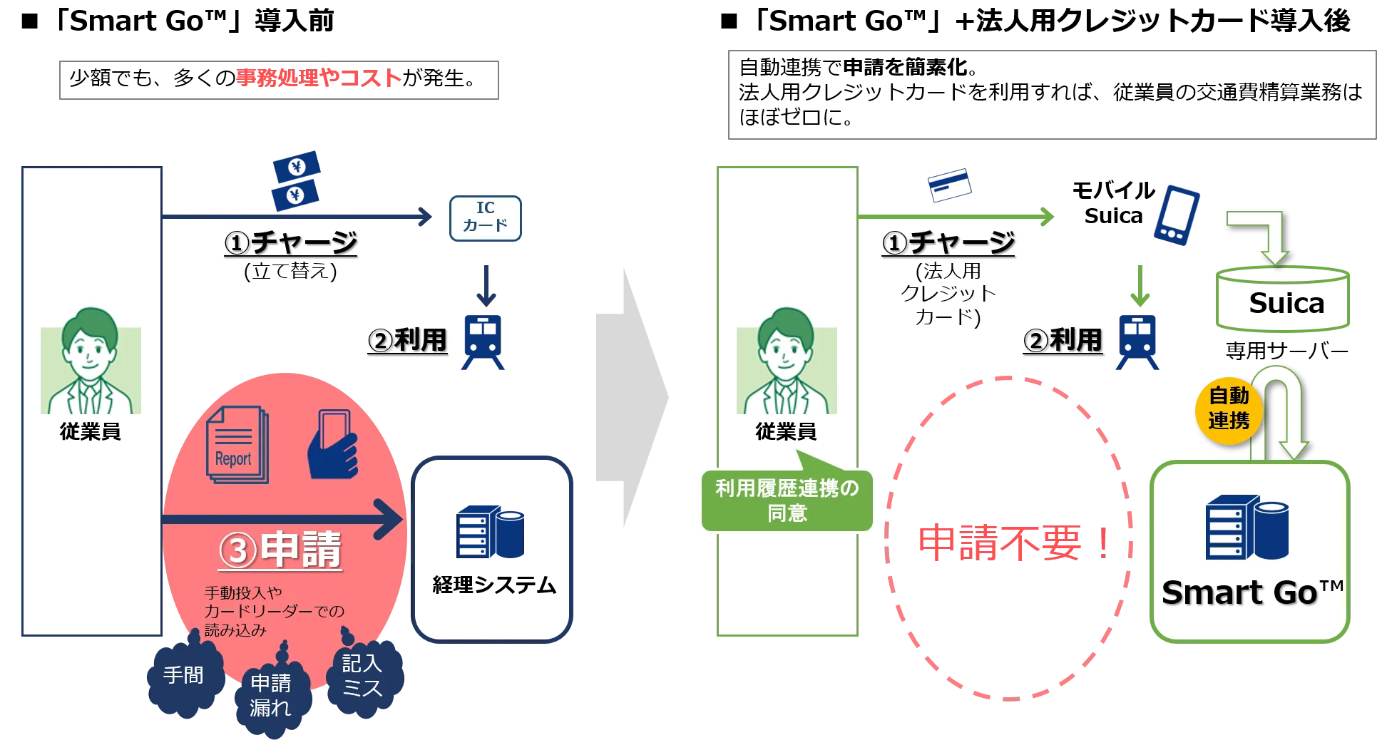 「Smart Go(TM)」は「モバイルSuica」サービスとの自動連携により、精算業務の大幅な簡素化を実現します。とくに「モバイルSuica」へのチャージを法人用クレジットカードで行う場合には、立て替え払いの精算も不要となり、従業員の交通費精算業務をゼロにすることが可能です。