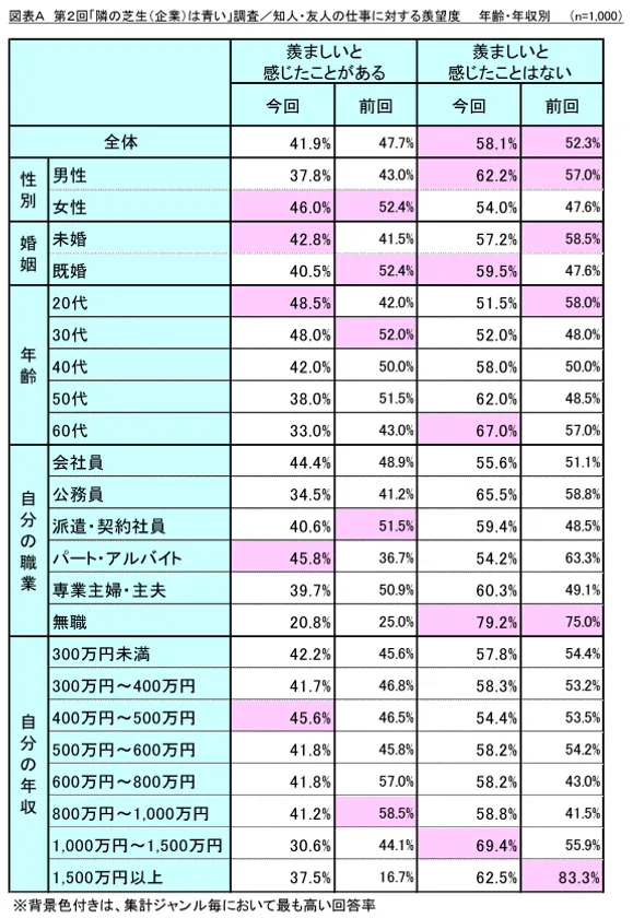 今回の調査によれば、約4割が知人や友人の勤め先について羨ましいと感じたことがあり、男性よりも女性、そして年齢層が低くなるほど、羨ましいと感じやすいという結果となりました。