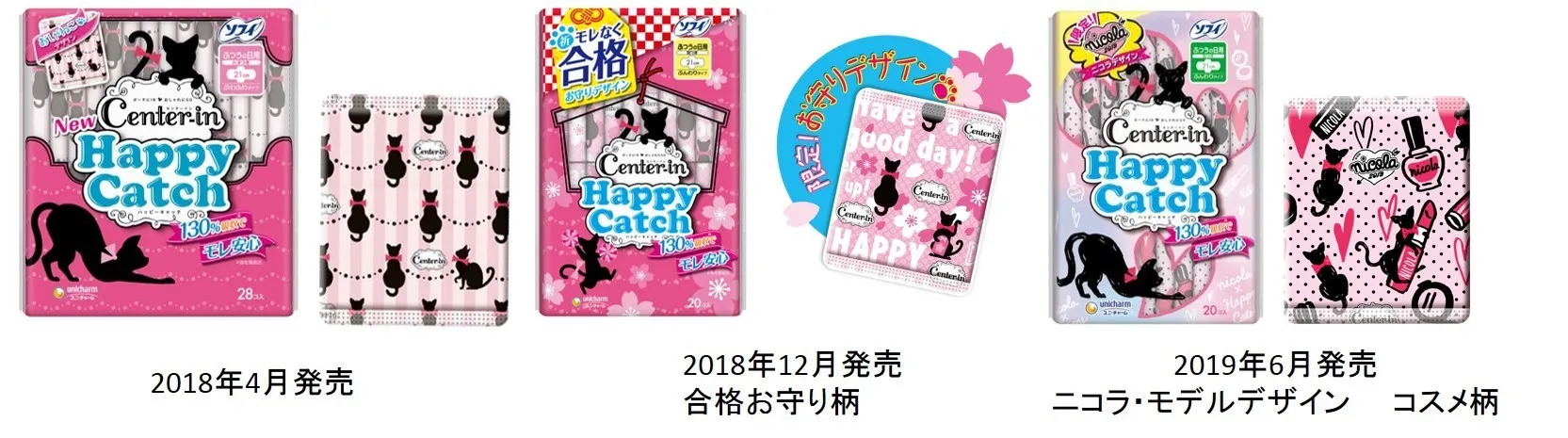 『ソフィ(R)センターイン ハッピーキャッチ』は、娘たちの「生理中はいつもモレないか不安」という悩みと「持ち物にこだわりたい」という思い、また「娘に合った商品を選びたい」という母親の思いを両立した“かわいくてモレ安心”な生理用ナプキンとして、2018年4月に発売いたしました。