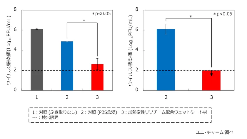 加熱変性リゾチームを配合したウェットシート材は、ステンレス板上およびウェットシート材中のMNVを顕著に不活化することが明らかとなった(図)。さらに、加熱変性リゾチームを配合したウェットシート材は、長期にわたりMNVの不活化効果および性状が安定であることも確認した。