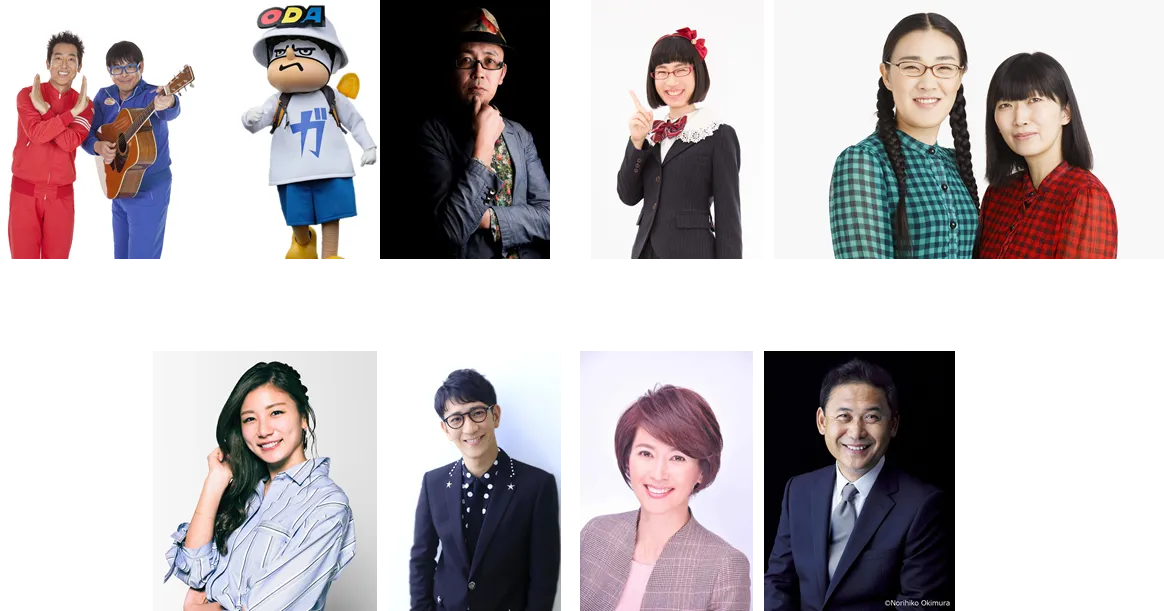 上左から順に、テツandトモ・ODAマン・FROGMAN・たかまつなな・たんぽぽ、下左から順に、青木愛・柴田英嗣・有森裕子・佐々木則夫