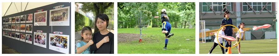 左から順に、外務省写真展、フェイスペイント・チャレンジ、フライングディスク・チャレンジ、「ミズノ ヘキサスロン」にチャレンジ