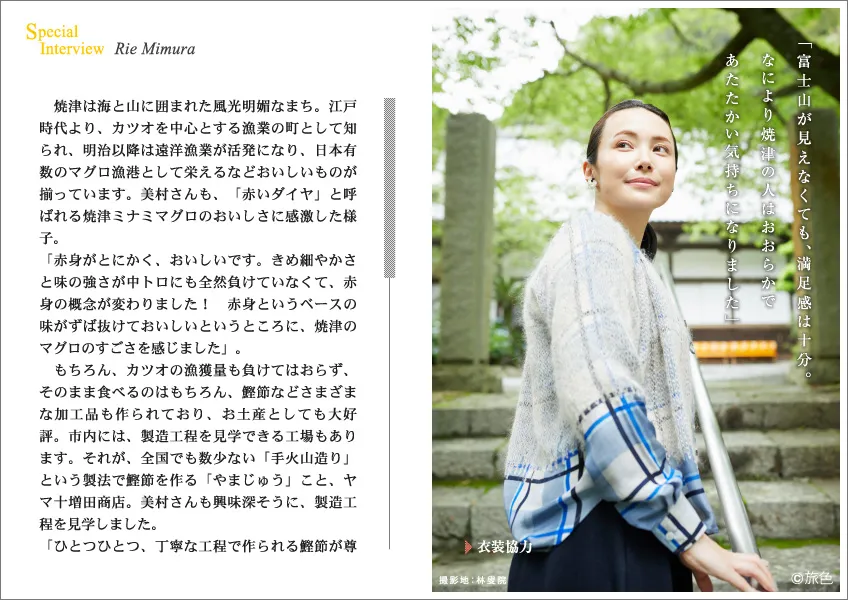 電子雑誌「旅色」は、静岡県焼津市と提携し、海と山に囲まれ、富士山ビューにも恵まれた焼津で、大人の女性がゆったり巡る旅を提案する別冊を公開しました。焼津に初めて訪れたという女優の美村里江さんが、マグロを堪能したり、温泉を楽しんだり。長く暮らす人のようにゆったり過ごしたなかで、印象に残ったものとは? 美村さんならではの視点を伺います。