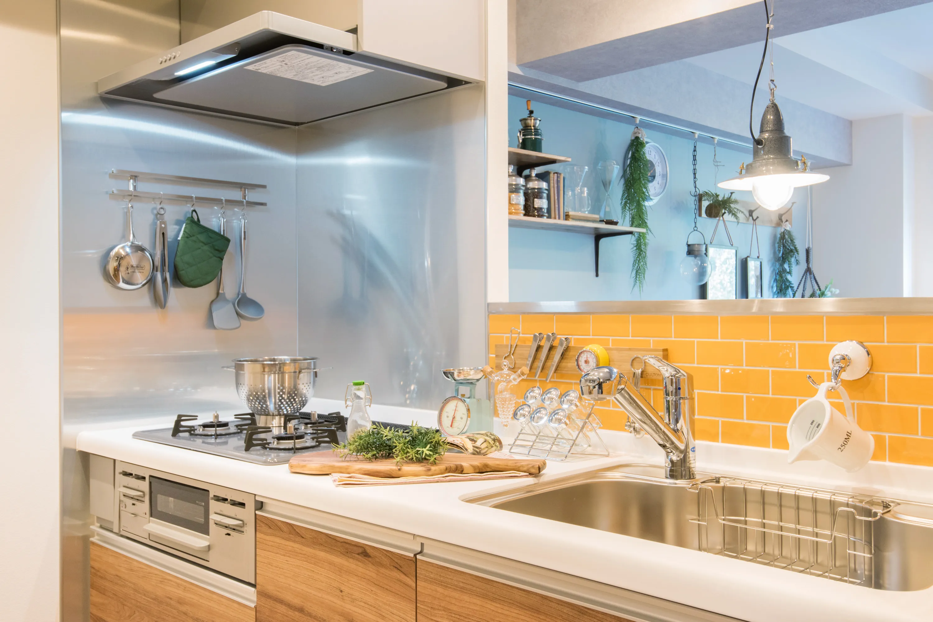 毎日使うキッチンには手元にビタミンカラーのタイル、コンロ側壁にはお手入れのしやすいステンレスを採用しています。