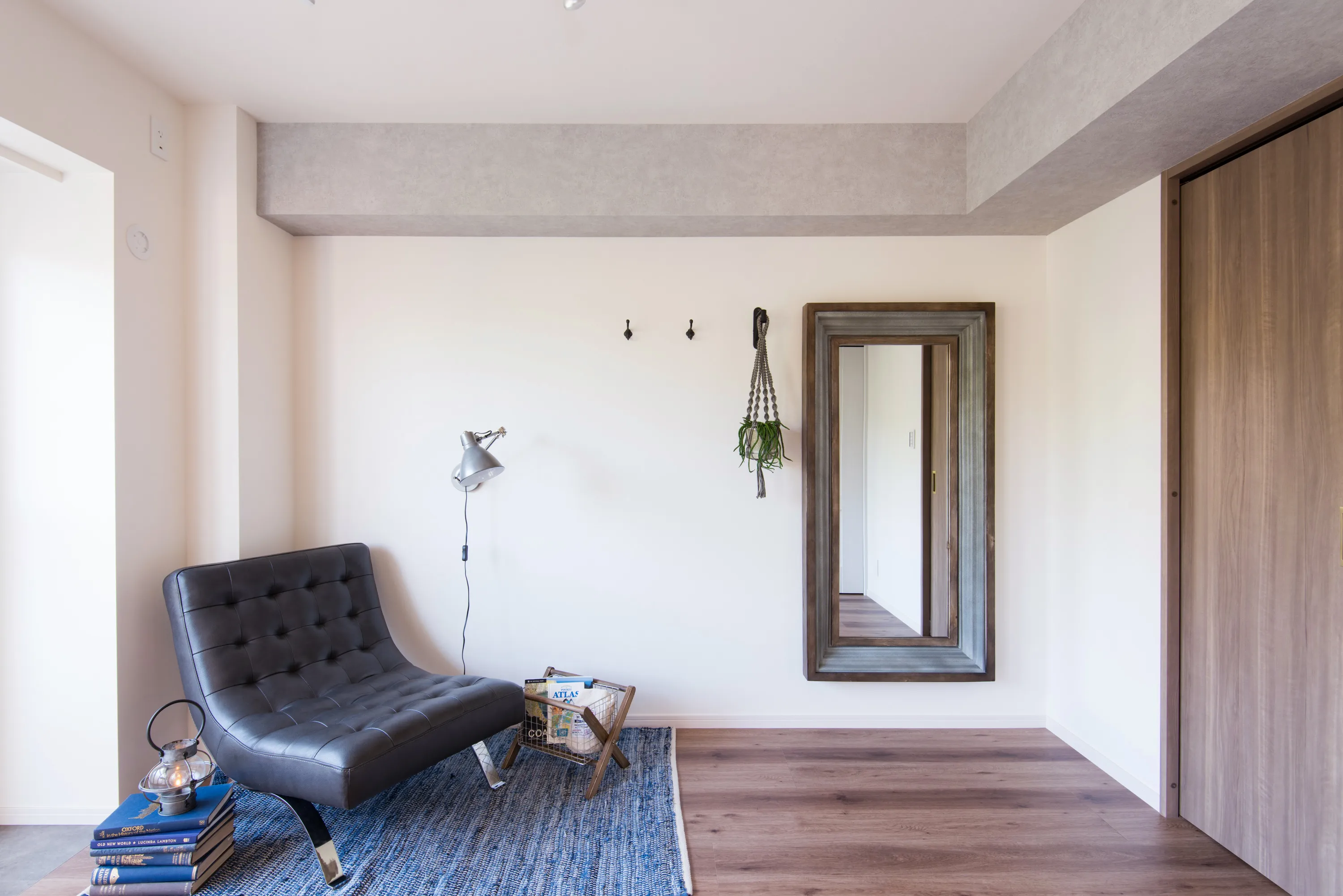 アイアンとウッドの枠が空間を引き立てる大型ミラーや窓際の癒し空間で生活に豊かさを。