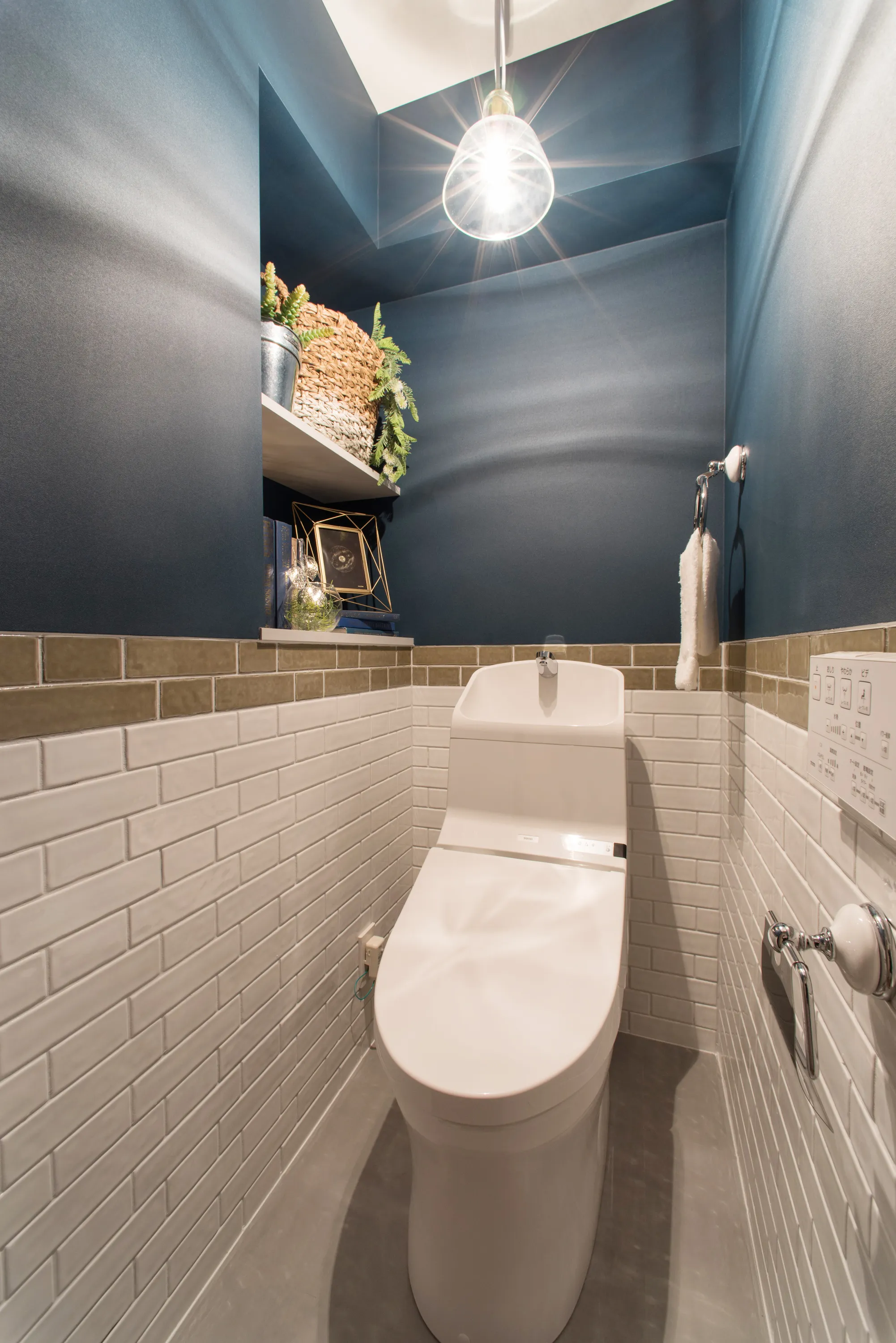 水廻りはホワイトとカーキのタイルとネイビーの壁紙で海外のホテルのような洗練された空間です。毎日使う洗面室の石鹸ホルダー、トイレのペーパーホルダーからタオル掛け、照明ひとつとってもこだわりを詰めこんだダルトンアイテムを取り入れています。リビング同様トイレにも雑貨を飾って愉しめる棚を設けています。洗面室の建具はBATHROOMと書かれたサインを取り付け、ダルトンらしい遊び心あるデザインを取り入れています。
