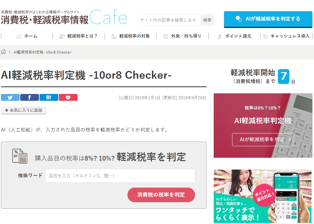 WEBマーケティング事業を手掛ける、エファタ株式会社(所在地:東京都新宿区、代表取締役:加納 隆史)は、AI(人工知能)が軽減税率を判定する「AI軽減税率判定機 -10or8 Checker-」を、2019年09月20日(金)より、当社が運営する「消費税・軽減税率情報Cafe」サイト内で提供開始しました。