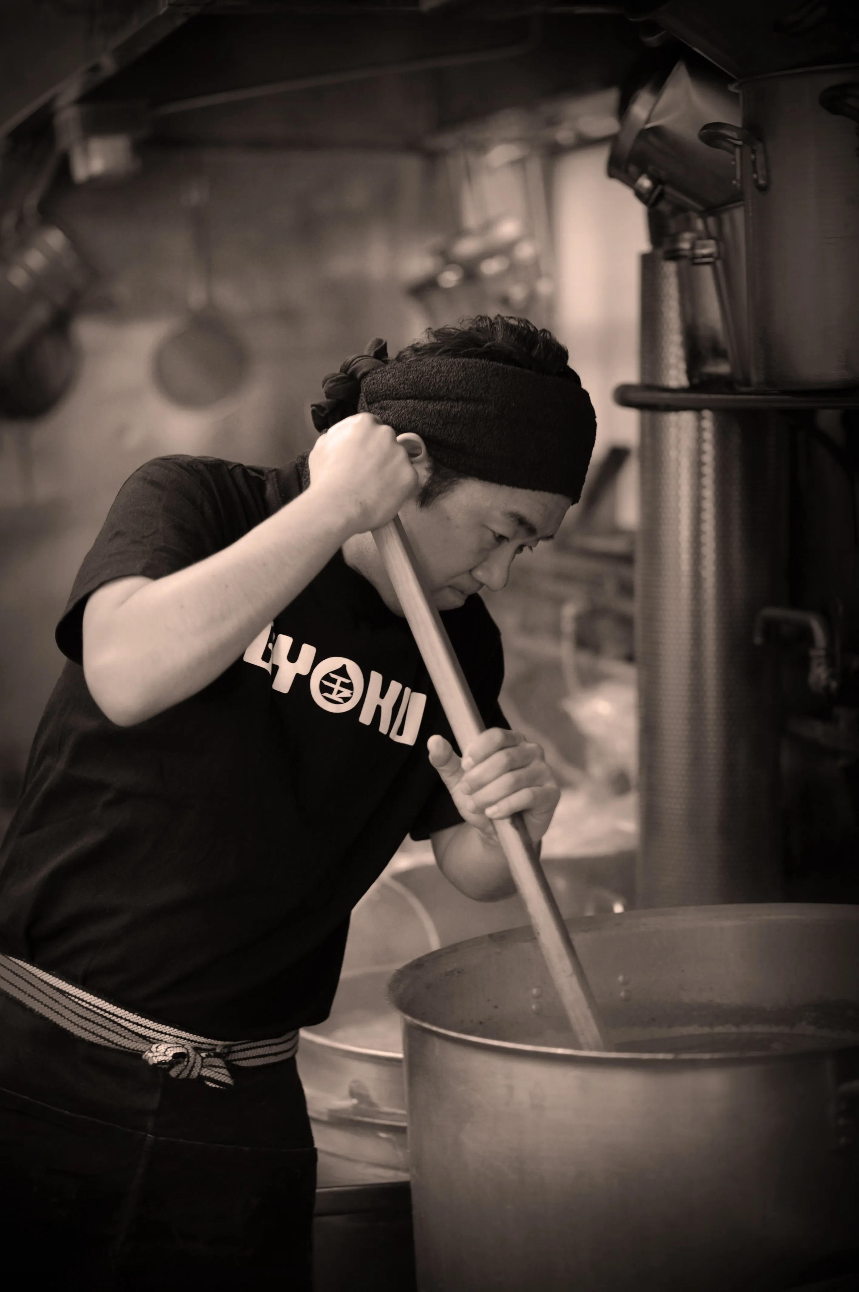 豚骨、鶏ガラなどの動物系素材に大量の魚介類、野菜を寸胴に入れて、最大限の強火で極限まで炊き上げる、素材の旨みが凝縮された力強いスープ。キレのある特製醤油を加えて味を引き締め、「玉」の魂ともいえる濃厚な魚介醤油スープが完成します。