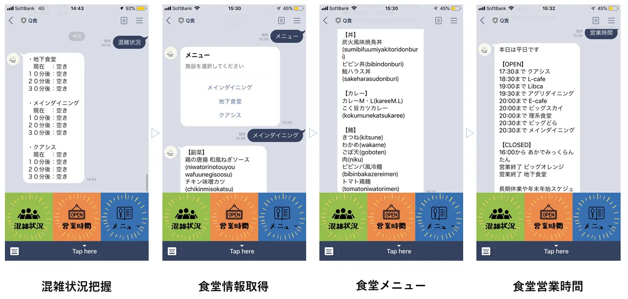 Q大食堂大図鑑LINE公式アカウントでは、食堂の混雑状況が分かる学内で研究中のセンサーと連携し、センサーで受け取った情報をもとに、複数の学生食堂のうち混まない食堂と時間をレコメンド。また、各食堂のメニューを表示させることができるようになった。