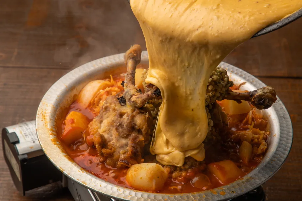 このメニューは、揚げ玉をまとわせた「悪魔の唐揚げ」を、トマトベースのスープととろーりチーズで仕上げた鍋。店自慢の鶏を500gも使用した唐揚げの山が大きなインパクトを放つ一品です。鍋が煮えたら、食べる直前にスタッフが目の前で「とろ~りチーズソース」をかけて仕上げます。