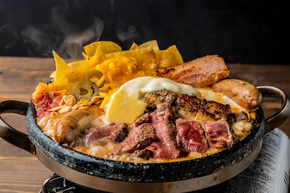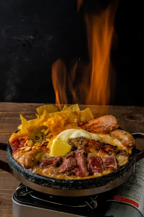 そして、こちらのメニューは、スタッフが目の前で鍋に火をつけて炎が燃え上がる演出にも注目! 炎をあげてグツグツと煮えたぎるその様子はまるでマグマのよう。「悪魔鍋」の言葉がぴったりなメニューです。シメはチーズとお米を加えて、チーズリゾットとしてお召し上がりいただけます。