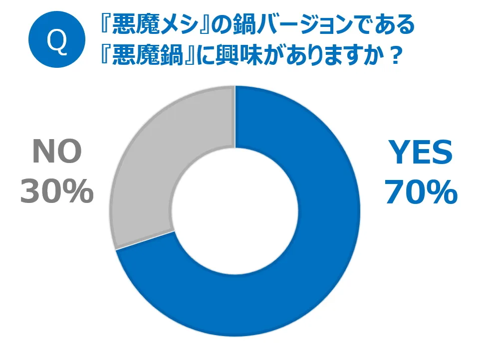 そこで、『悪魔メシ』の鍋バージョンである『悪魔鍋』について聞いたところ、実に70%が「興味がある」と回答。その理由としては、「ボリュームがあり、とても美味しそう」(18歳・男性)、「友人達と食べると盛り上がりそう」(24歳・女性)、「いつも同じ鍋になってしまうから、変わったものも食べてみたい」(30歳・女性)などの声があがっています。