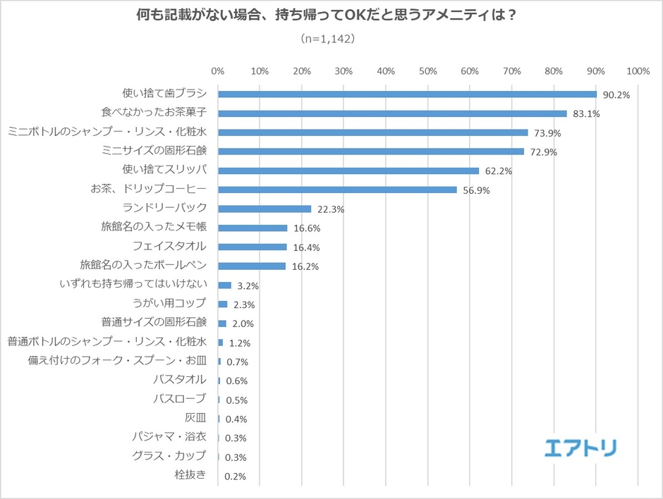 「歯ブラシ」や「ミニボトルのシャンプー・リンス・化粧水」などの使い捨てタイプについては大多数が持ち帰りOKと判断しました。「お茶、ドリップコーヒー」までは過半数がOKとする一方で、「ランドリーバック」(22.3%)、「旅館名の入ったメモ帳」(16.6%)、「フェイスタオル」(16.4%)、「旅館名の入ったボールペン」(16.2%)は迷う人が多い様子が窺えました。SNSの声では「宿名が入っているものはノベルティだから持ち帰って良い」と言う意見もありましたが、宿の人に一声かけるとマナーの上でも良いでしょう。