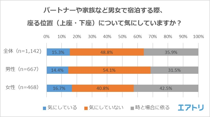 全体では15.3%の人が「気にする」と答えました。年齢別だと大きな差がなかったものの、男女別で見たところ、男性は過半数が「気にしていない」(54.1%)と答えた一方で、女性は13ポイントも少ない40.8%となりました。女性が上座に座ることをマナー違反と考える人もいることから、女性の方が座席には意識を配っているようです。その逆にSNSでは「上座に座っているのにおひつとしゃもじが置かれる」という女性の嘆きもあり、宿側のマナー違反もあるようです。