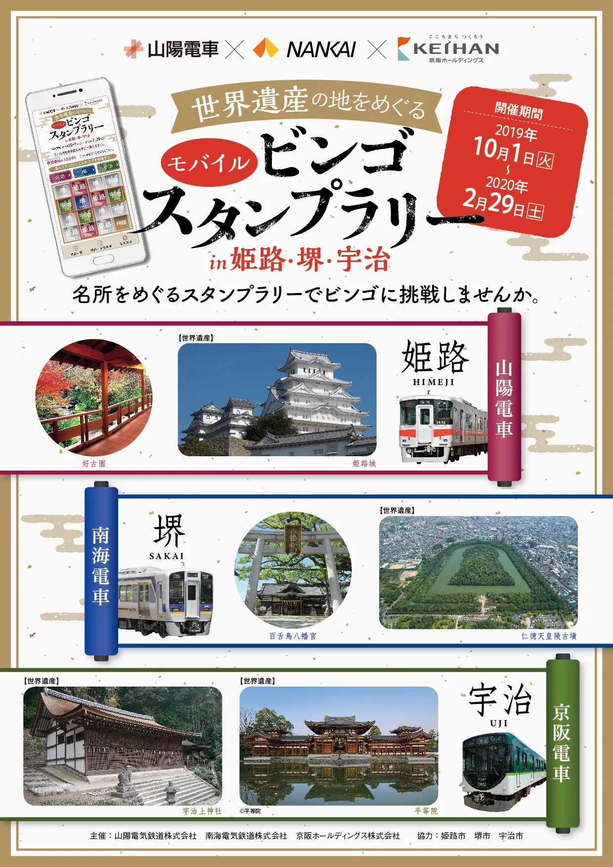 山陽電気鉄道株式会社(本社:神戸市長田区、社長:上門 一裕)と南海電気鉄道株式会社(本社:大阪市浪速区、社長:遠北 光彦)、京阪ホールディングス株式会社(本社:大阪市中央区、社長:石丸 昌宏)では、「山陽・南海・京阪 世界遺産の地をめぐる モバイルビンゴスタンプラリー in姫路・堺・宇治」を2019年10月1日(火)から開催します。