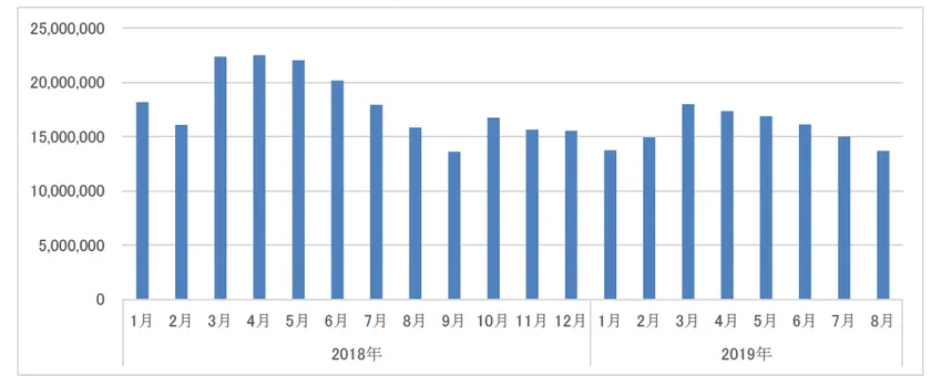 <ドラッグストア2019年8月のインバウンド消費調査> 訪日客数減少の8月、DgSのインバウンド消費も約14%減少 ~さらに存在感高まる化粧品 食品の成分を配合したコスメが人気~
