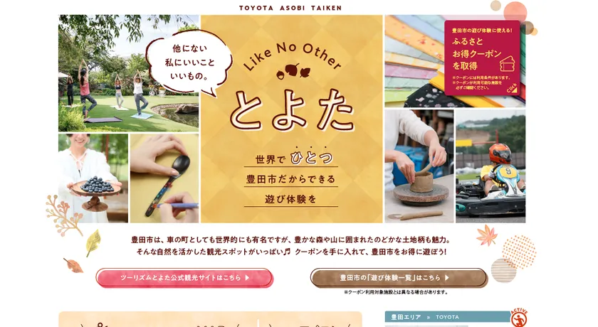 一般社団法人ツーリズムとよたは、じゃらんnetと連携し、9月30日(月)から12月2日(月)にかけ、豊田市の遊び体験が楽しめるお得なキャンペーン「Like No Other とよた~世界でひとつ、豊田市だからできる遊び体験を~」を実施します。愛知県内最大の面積である豊田市では、秋にぴったりの気軽に楽しめる体験スポットが数多くあります。本キャンペーンでは、じゃらんnetからの予約で使える最大2,000円オフになるお得なクーポンも配布。食、体験、ものづくりなど、他にない特別な秋を豊田市で過ごしてみませんか。