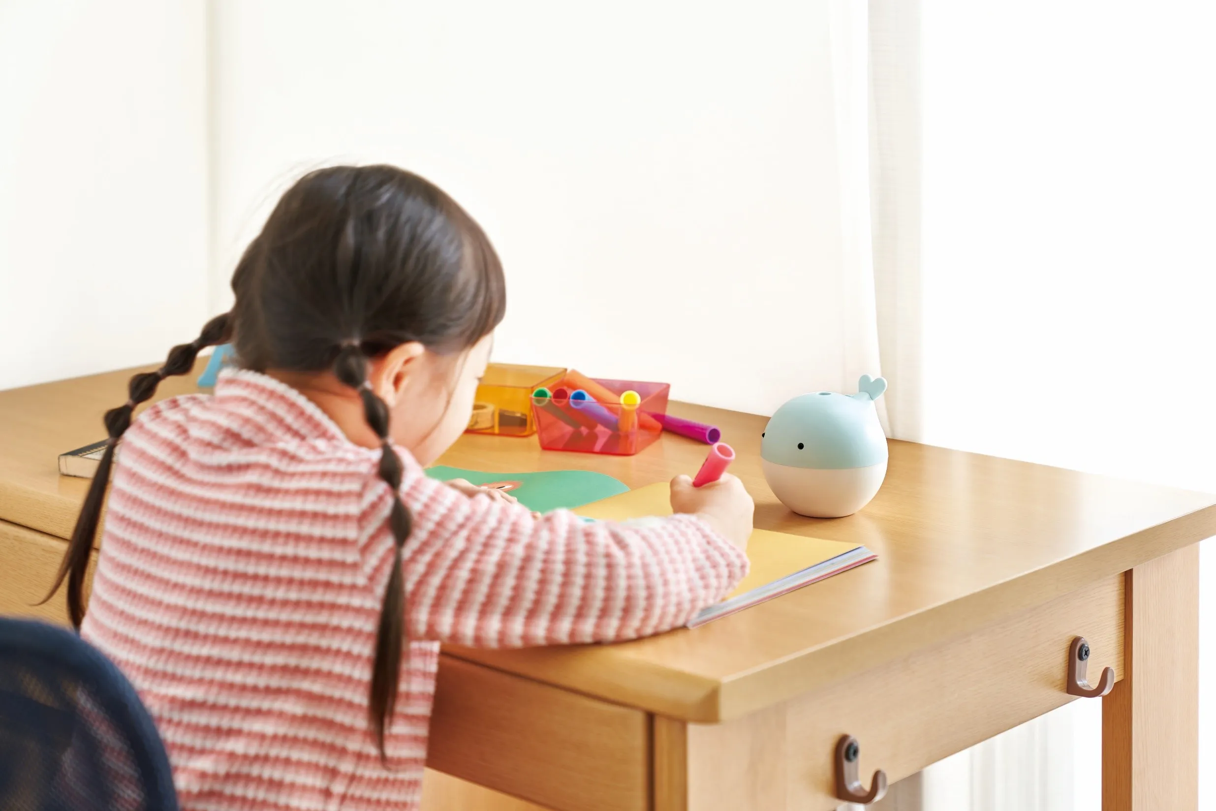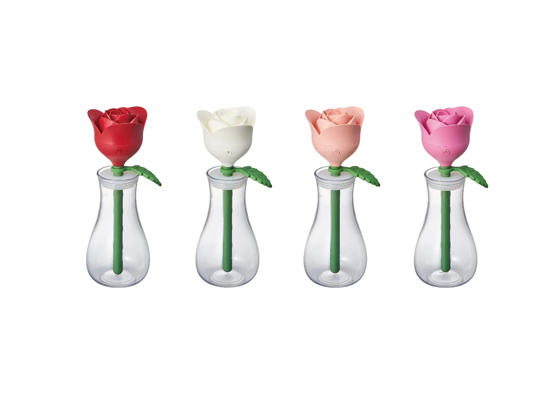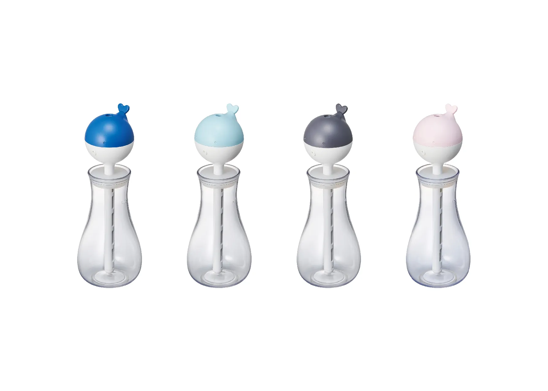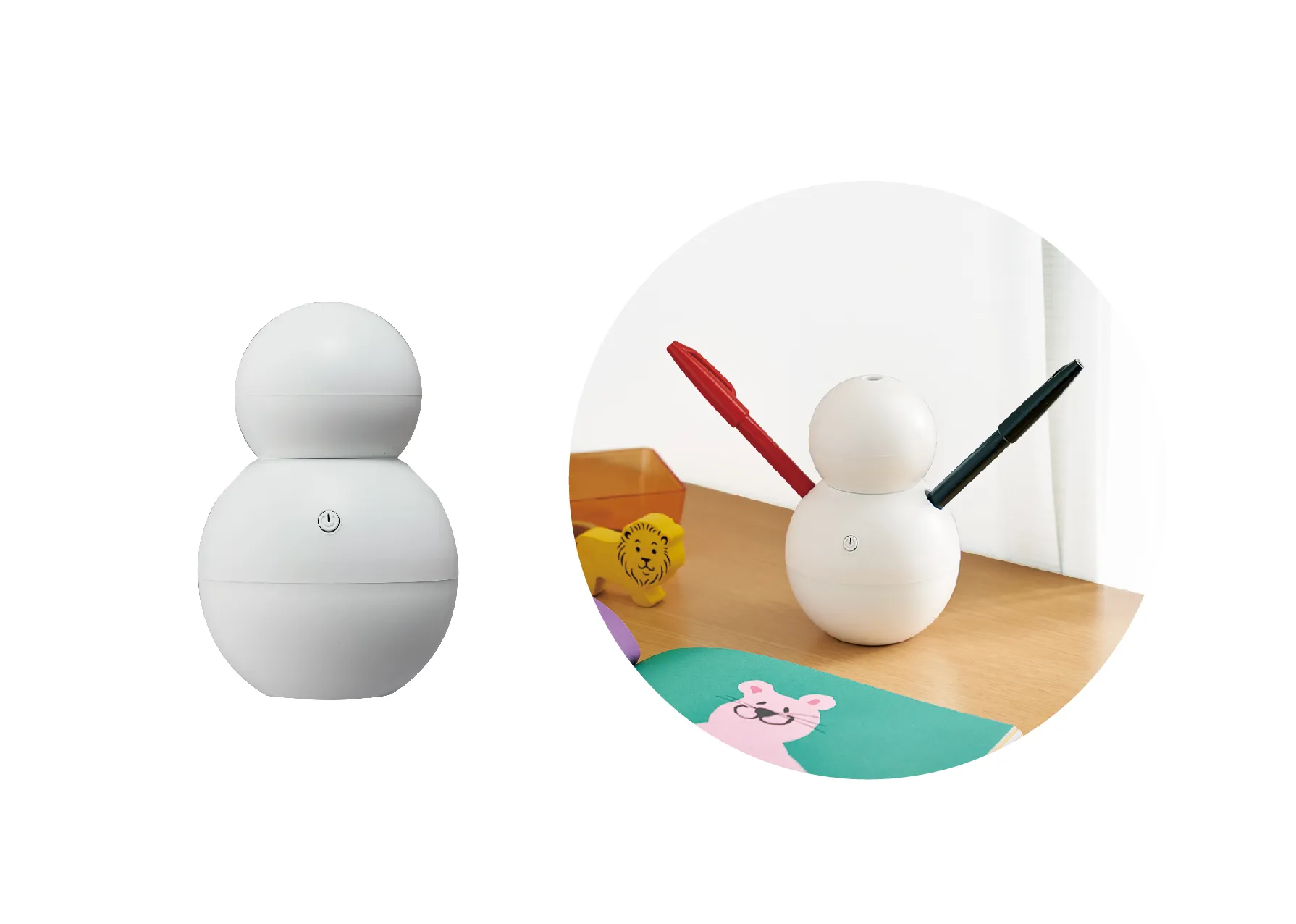 スティック加湿器には、「くじら」「バラ」「ティーカップ」をあしらった3モデル、卓上加湿器には「くじら」、雪だるまをイメージした「スノーマン」の2モデルがあります。スティック加湿器は、専用の容器と専用キャップ付き。スノーマンはペン立てとしても使用ができ、デスク周りを彩ります。