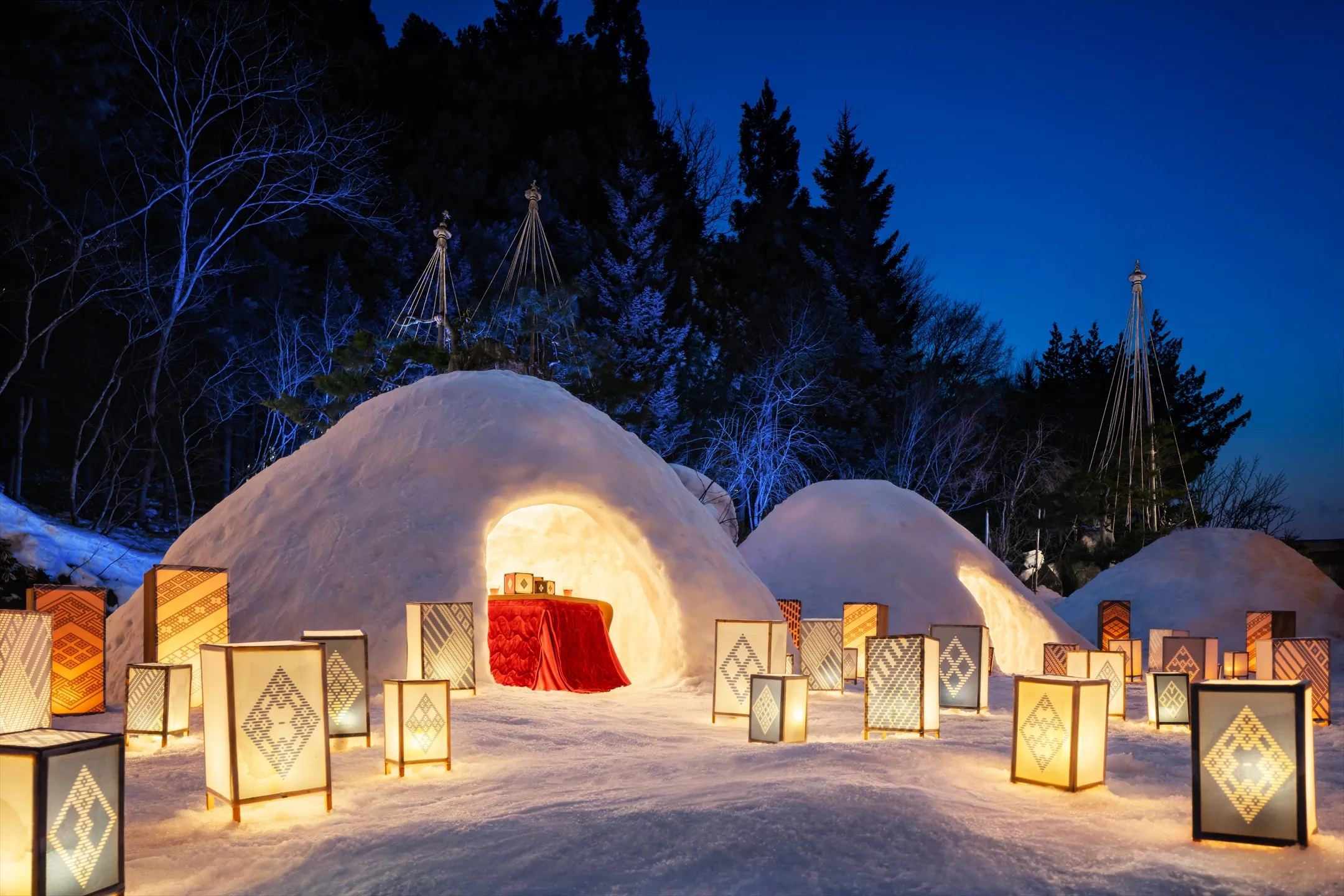 2月には津軽四季の水庭に、こぎん刺し模様の灯篭やランプで設えた「こぎんかまくら」が誕生します。界 津軽ならではの、かまくらの中での開運体験も楽しめます。