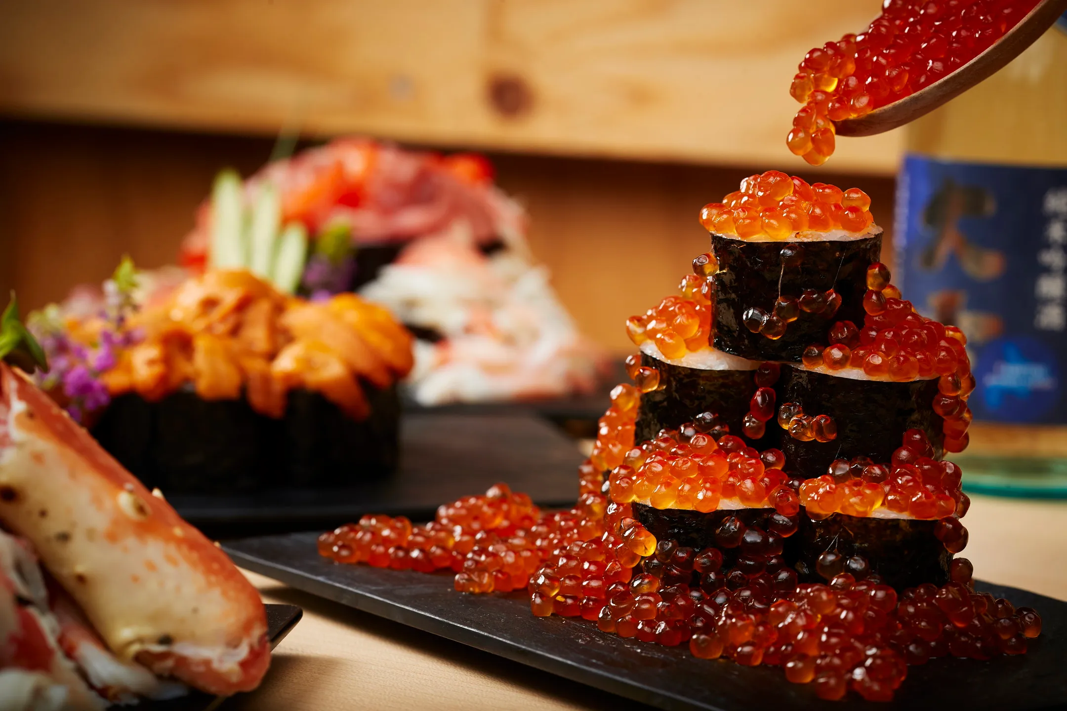 こぼれ寿司に使用する海鮮は、主にイクラ、カニ、マグロ、ウニ、ホタテです。冬の魚介類は、寒さの深まりとともに身が詰まり、上質な脂がのるため、味わいが増すと言われています。このような旬の海鮮をこぼれるぐらいに盛り付けた寿司を、当リゾートでは「こぼれ寿司」と名付けました。