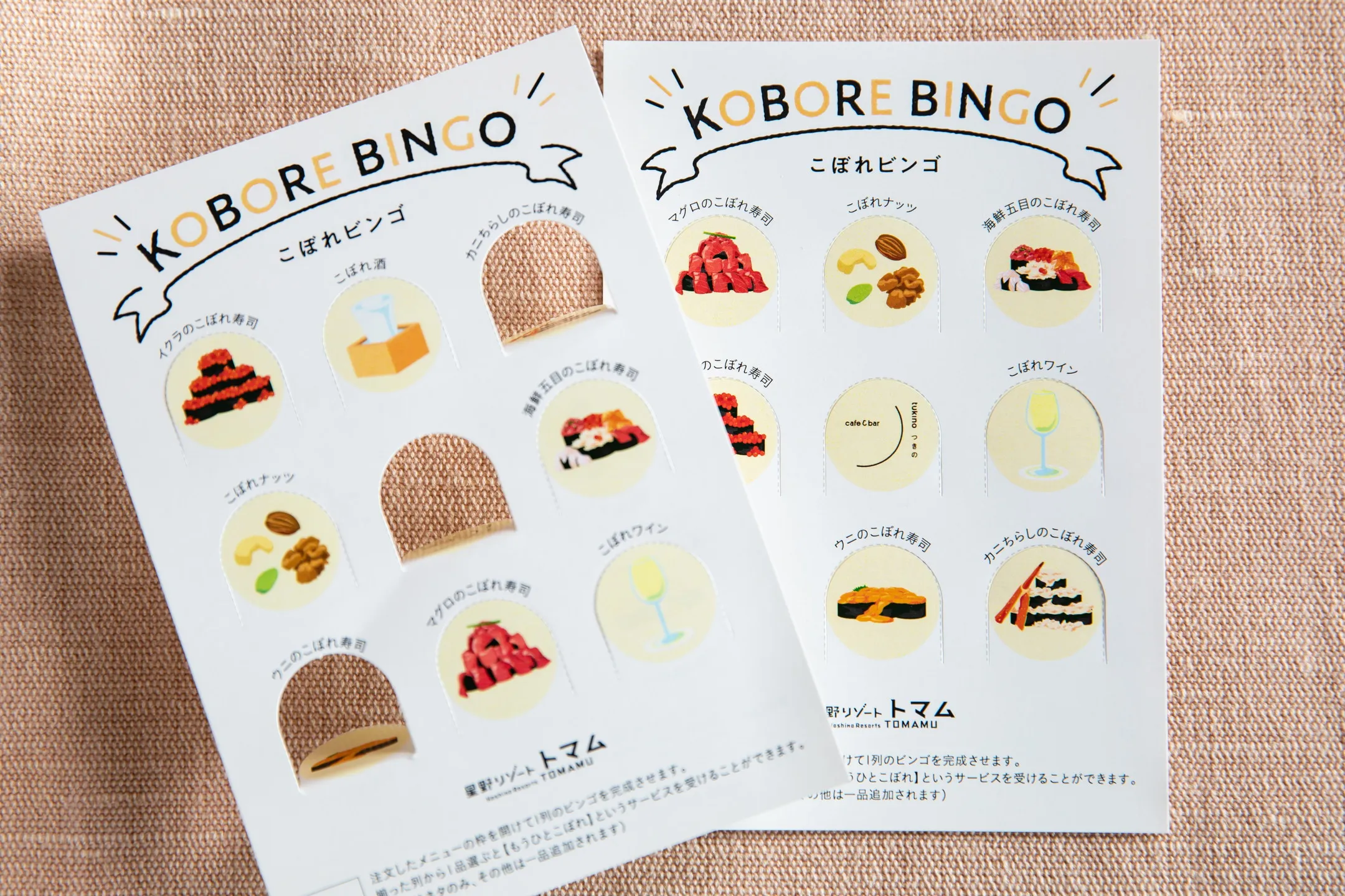 こぼれ寿司のメニュー表として使用するのは、ビンゴカードです。全9マスあるカードには、1マスに1メニューが記載されており、お客様が注文した商品のマス目を開けることができます。ビンゴが完成すると、開けた列の商品のうち1品、海鮮をさらに寿司の上に追加する「もうひとこぼれ」というサービスを受けられます。