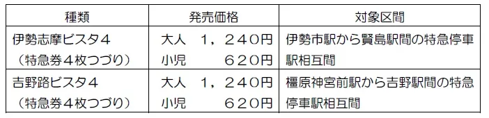 なお、2019年10月31日(木)をもって、これまで発売しておりました回数特急券「伊勢志摩ビスタ4」および「吉野路ビスタ4」の発売を終了します。