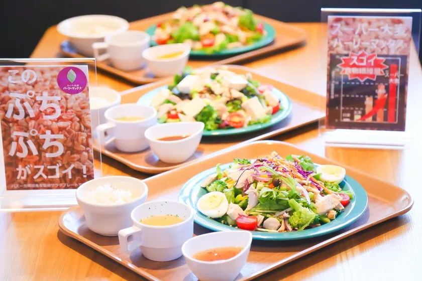 このサラダプレートに、玄米などの雑穀と比べても低糖質で、食物繊維リッチな岡田先生の推奨食材である、スーパー大麦「バーリーマックス(R)」が採用されました。※キャンパス内の学食およびカフェは一般の人も利用可能です。