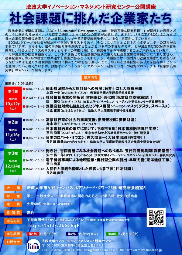 法政大学イノベーション・マネジメント研究センターでは、10月12日(土)、11月16日(土)、12月14日(土)に全3部の公開講座「社会課題に挑んだ企業家たち」を開催します。