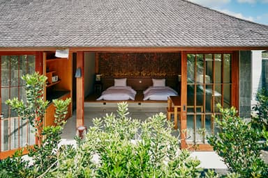 現代を休む日、聖なる川に向かう運河の集落。「星のや」ブランド海外1軒目の施設である星のやバリは、ウブドの東側に位置し、平らかな土地が急激に深く谷底の渓流へと切り込むバリらしい地形に広がります。約3ヘクタールの敷地は、運河を模したプール、渓谷に浮かぶガゼボ、渓谷を望むダイニング、バリ建築の技法で仕上げたヴィラなど、ウブドの大自然や文化を感じられる空間で構成されています。