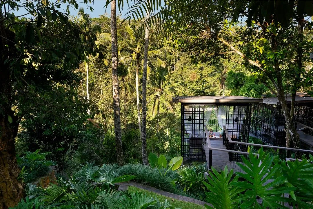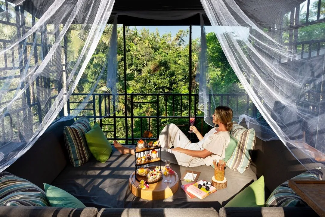 深さ170メートルに及ぶ渓谷にせり出すように造られた星のやバリのカフェ・ガゼボは、ソファに座ると宙に浮いたような気分を味わえる不思議な空間です。午後になると、涼しく心地よい風と眼下に広がる熱帯の木々に大自然を感じながらゆったり過ごせます。自然を眺めながらうたた寝をしたり、本を読んだり、絵を描いたりと好きなことをするのに絶好の場所です。
