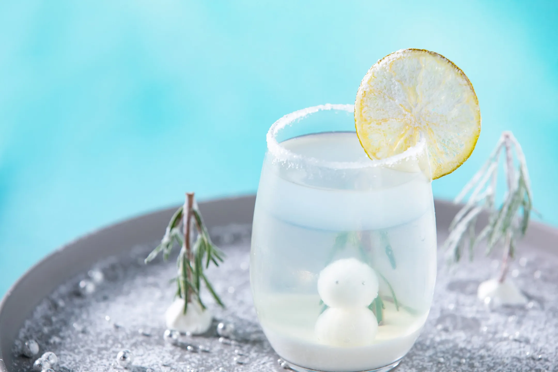 霧氷テラスでは、トマムの雪景色を表現したオリジナルカクテル「スノーカクテル」を提供します。これは、「マルガリータ」というライムジュースとコアントローを使用したカクテルです。ローズマリーをエゾ松に見立てて、雪だるまはホワイトチョコレートを使用しており、見た目も味も楽しめます。