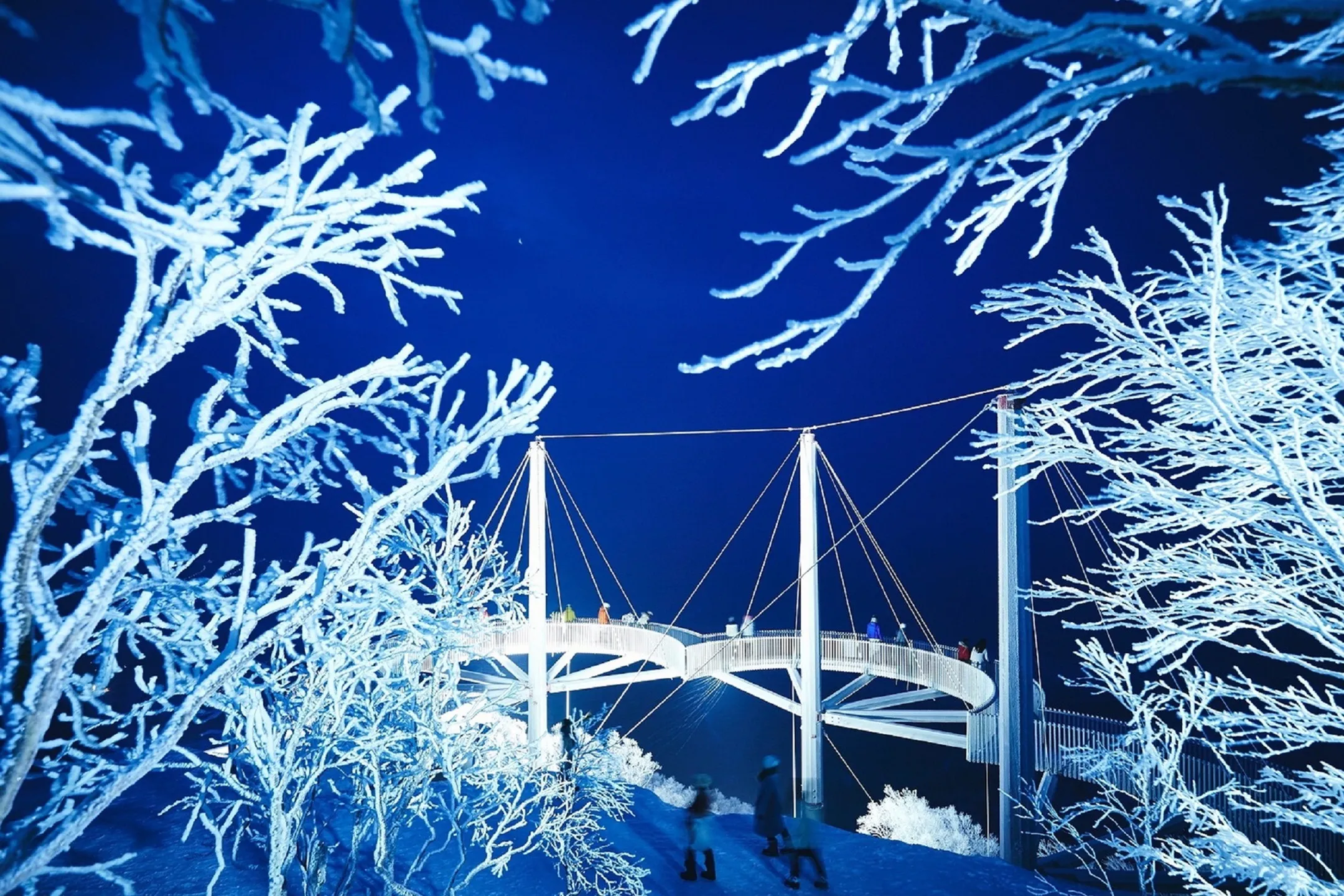期間限定で霧氷テラスにある展望スポット「Cloud Walk(クラウドウォーク)」や「Cloud Bar(クラウドバー)」と道沿いなどをライトアップします。ライトアップされた霧氷を様々なスポットで眺めながら過ごせます。霧氷がライトに照らされて、きらきらと輝く光景は、夜にしか見られません。昼とは違う霧氷の絶景を眺めることができます。