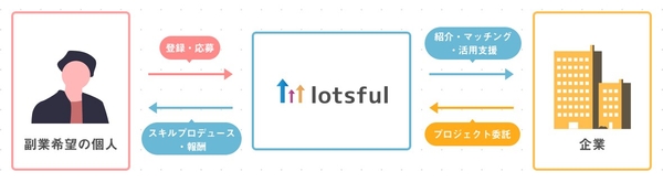「lotsful」は、スキルアップを目的にした経験豊かな副業人材をターゲットに、大手企業・ベンチャーの両方に精通した専任タレントプランナーがマッチングを行う副業人材マッチングサービスです。業務切り出しのサポートから、副業スタート時の煩雑な契約周りまでパーソルの豊富な人材支援ノウハウを活かしたオンボーディングをサポートし、副業受け入れが初めての企業については副業人材活用の仕組みづくりから支援します。企業と個人が成長できる副業サイクルの構築を目指して取り組んでまいります。