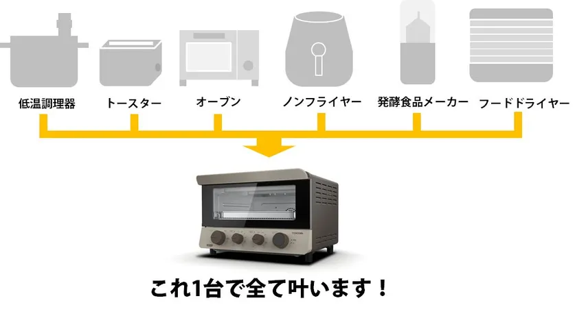 トースト、オーブン調理、油を使わずヘルシーなノンフライ、じっくり発酵や乾燥調理、お肉を柔らかく仕上げる低温調理の1台6役。