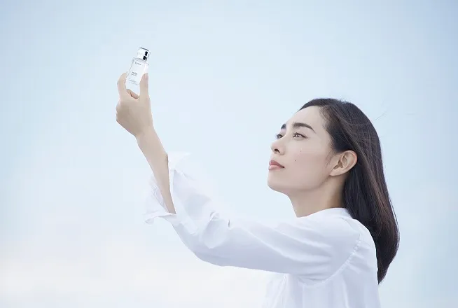 空にかざしたスクワランを見つめる吹石さん。そこへ、空からの恵みのように、スクワランが1滴。
