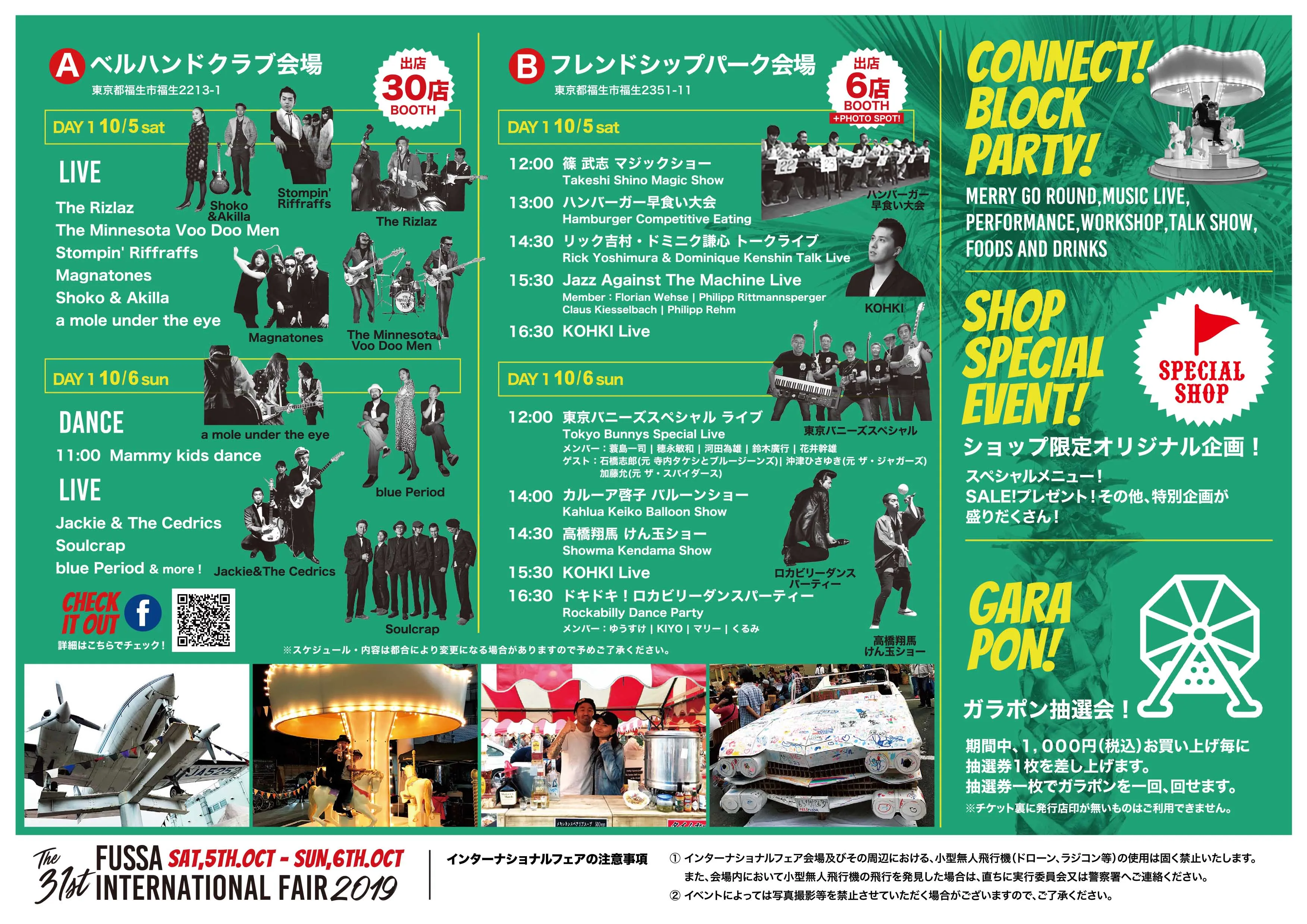 飲食ブース・篠武志マジックショー・ハンバーガー早食い大会・リック吉村&ドミニク謙心トークライブ・Jazz Against The Machine Live・KOHKI Live・東京バニーズスペシャルライブ・カルーア啓子バルーンショー・高橋翔馬けん玉ショー・ドキドキ!ロカビリーダンスパーティーほか