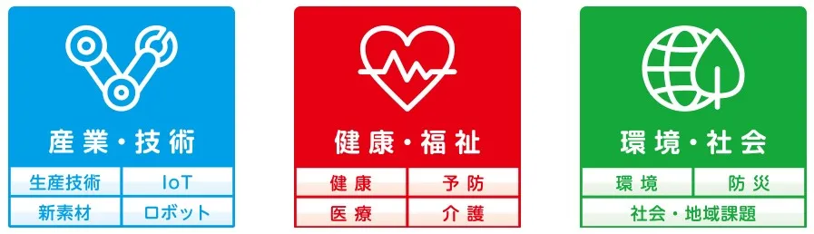 環境改善・保全、省エネ・リサイクル、水素・燃料電池、二次電池、再生可能エネルギー、スマートグリッド、高機能建材・高効率建築、防災・防犯、農林水産業の高効率化、その他