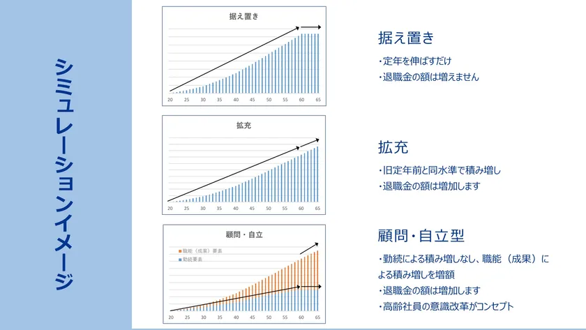 ●近年の定年延長のトレンドを踏まえ、3つのシミュレーション結果を提供します